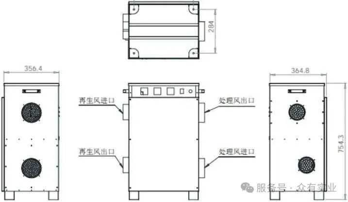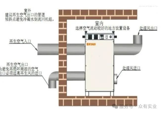 除濕機置于室外:干空氣出口和處理空氣進口連接到除濕區(qū)域。再生風(fēng)入口和濕空氣出口不需要連接管道。